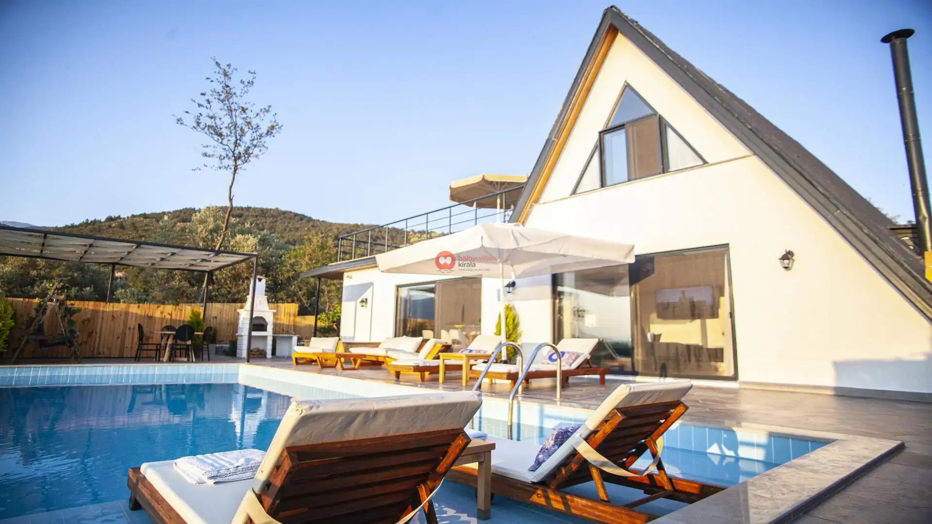 Temiz havanın, gökyüzünün ve güneşin hiç eksilmediği havuz ve bahçe alanında bitmesin isteyeceğiniz bir tatil sizleri bekliyor. Şehirden uzak sakin tatil arayan misafirlerimizin tam olarak aradığını bulacağı kriterlere ve olanaklara sahip villa, doğayla iç içe konumu ve tatilinize renk katacak havuz terasında şezlong takımı, oturma grubu ve barbekü alanı ile keyifli bir alana sahiptir. Geniş konforlu oturma odası ve tam donanımlı açık mutfağı; birinci yatak odasında çift kişilik yatak, jakuzi ve ebeveyn banyosu; ikinci yatak odasında çift kişilik yatak ve ebeveyn banyo yer almaktadır.
